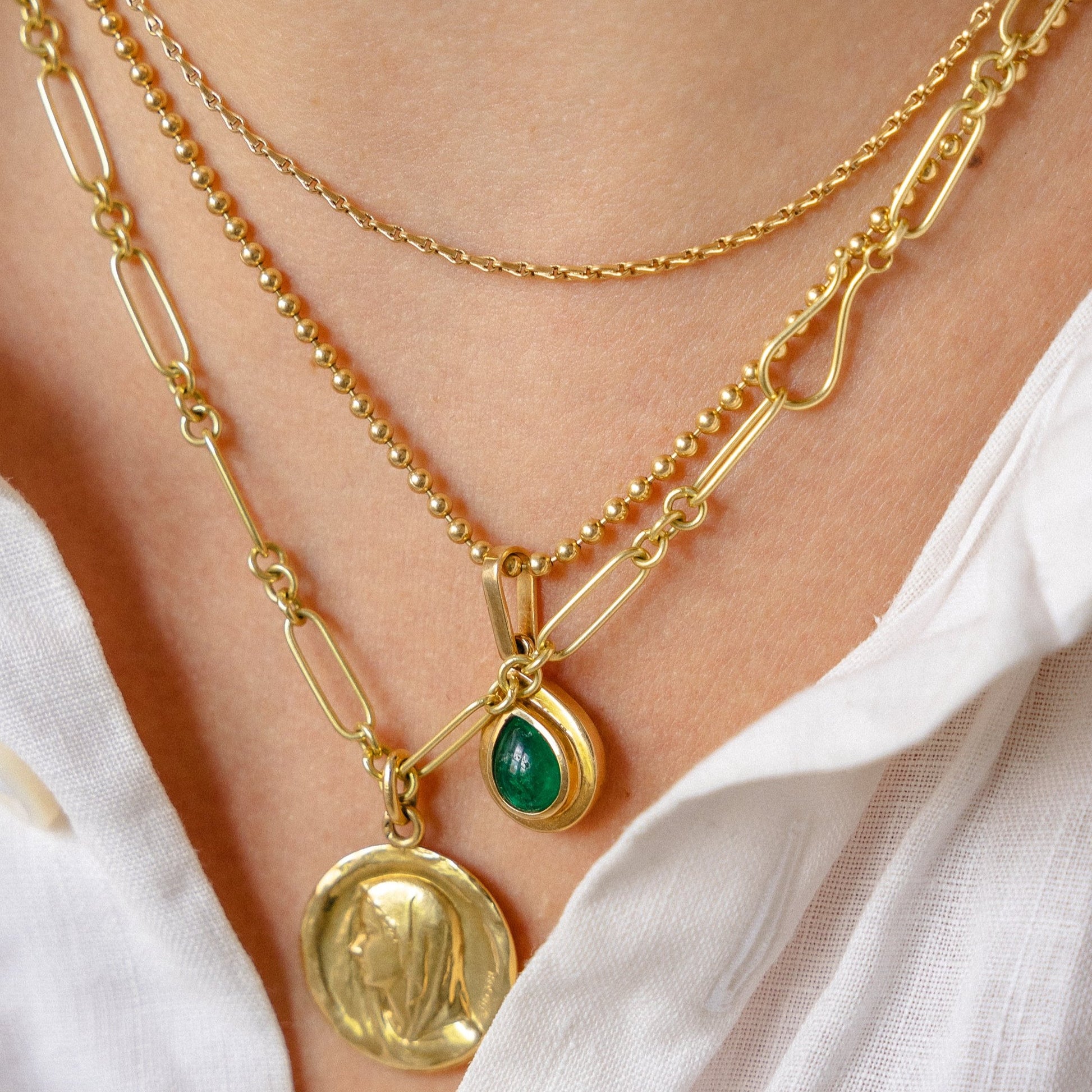 This handmade 18k yellow gold trombone link chain combines elegance with versatility. Measuring 18 inches, it features elongated, tubular links that showcase a subtle patina, adding warmth and depth to the gold. Finished with a secure shepherd hook closure, this chain is both durable and refined. Whether worn alone or layered with other pieces, it’s a modern classic that easily complements any style.