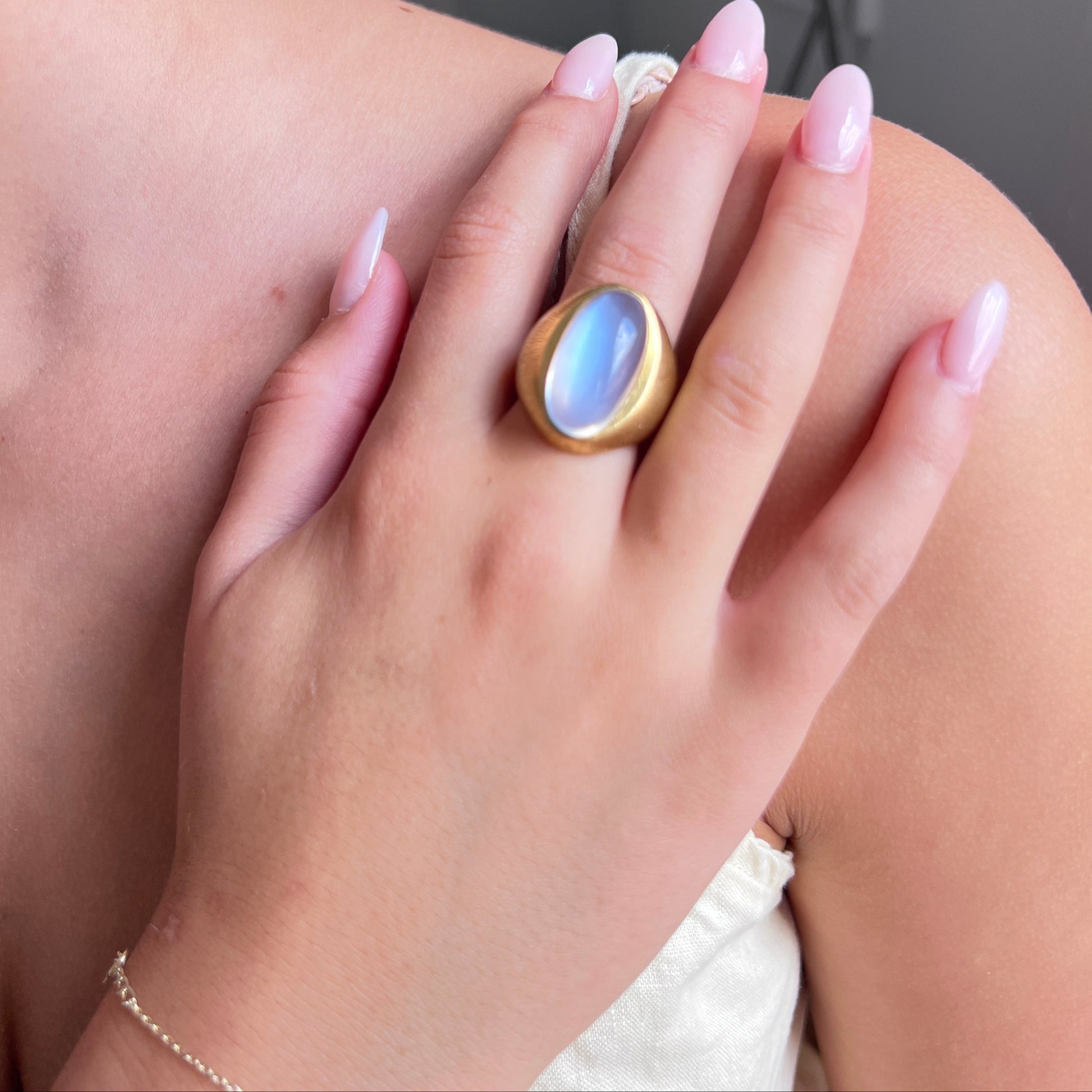 A striking modernist ring in heavy 18 karat yellow gold, likely of European make in the 1960s–70s. The design is sculptural and bold: a broad one-inch face tapering to a quarter-inch band, its surface worked in a soft textured finish that enhances the play of light across the gold. At the center rests a luminous oval moonstone cabochon, alive with blue sheen, its smooth glow set in contrast against the matte metal. Solid shoulders give the ring an impressive presence and weight, embodying the modernist aesthetic of mid-century European ateliers.