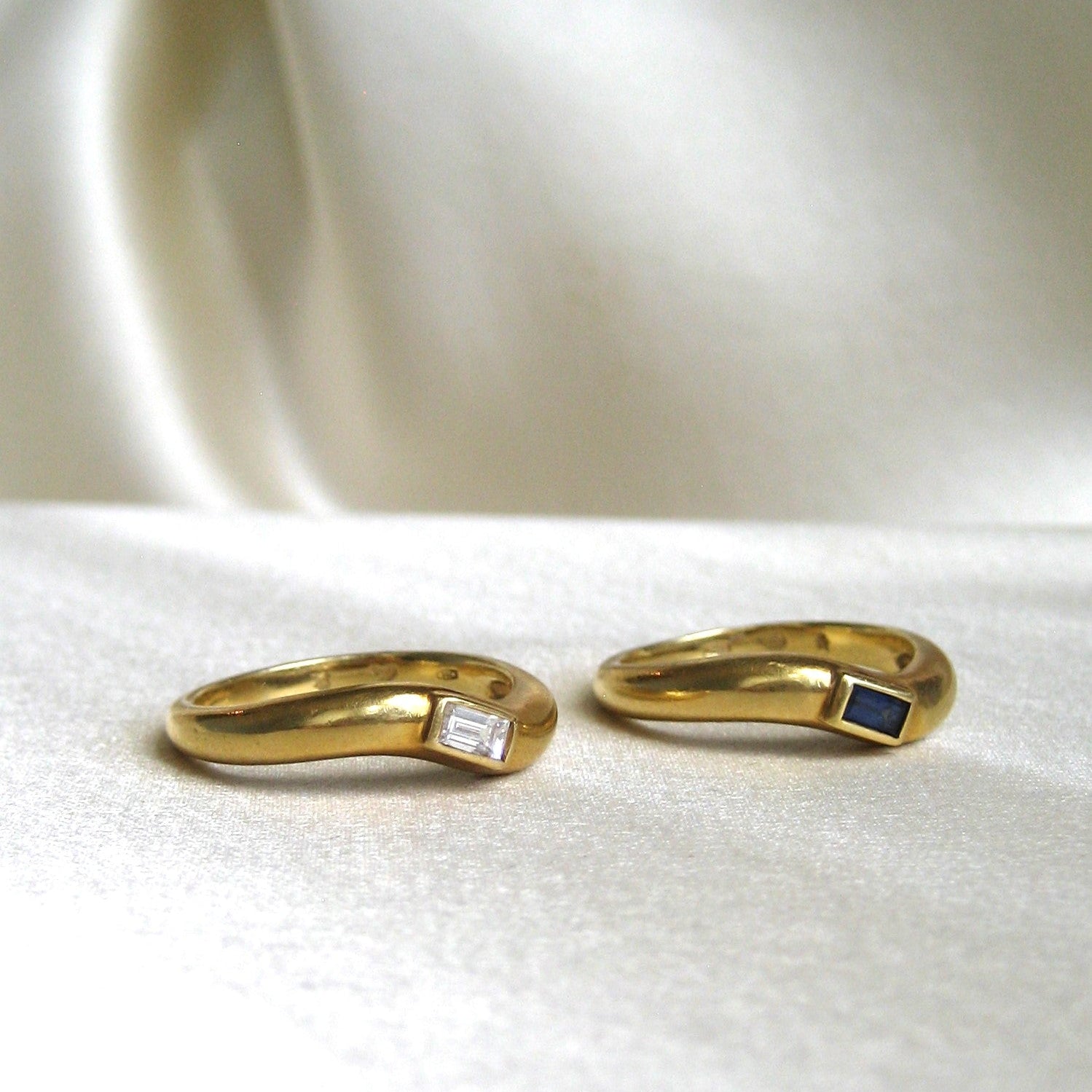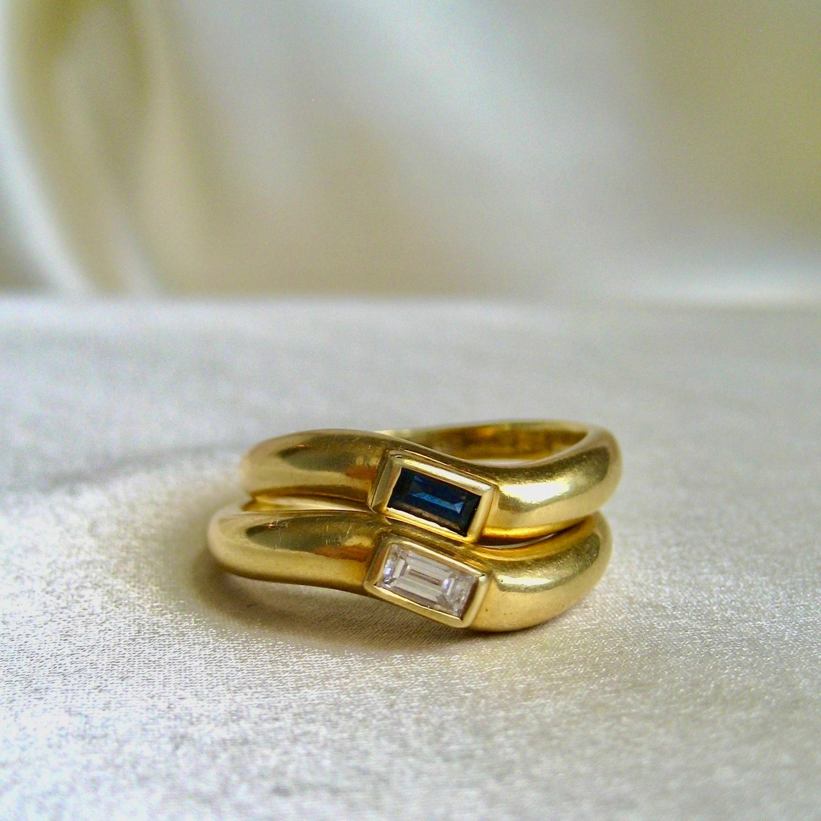 One ring is set with a bezel-set sapphire baguette (2mm x 4mm), weighing approximately 0.12 carats, while the other showcases a bezel-set diamond baguette (2mm x 4mm), weighing approximately 0.10 carats. The clean lines and precise cuts create a refined, architectural look that’s both contemporary and timeless.