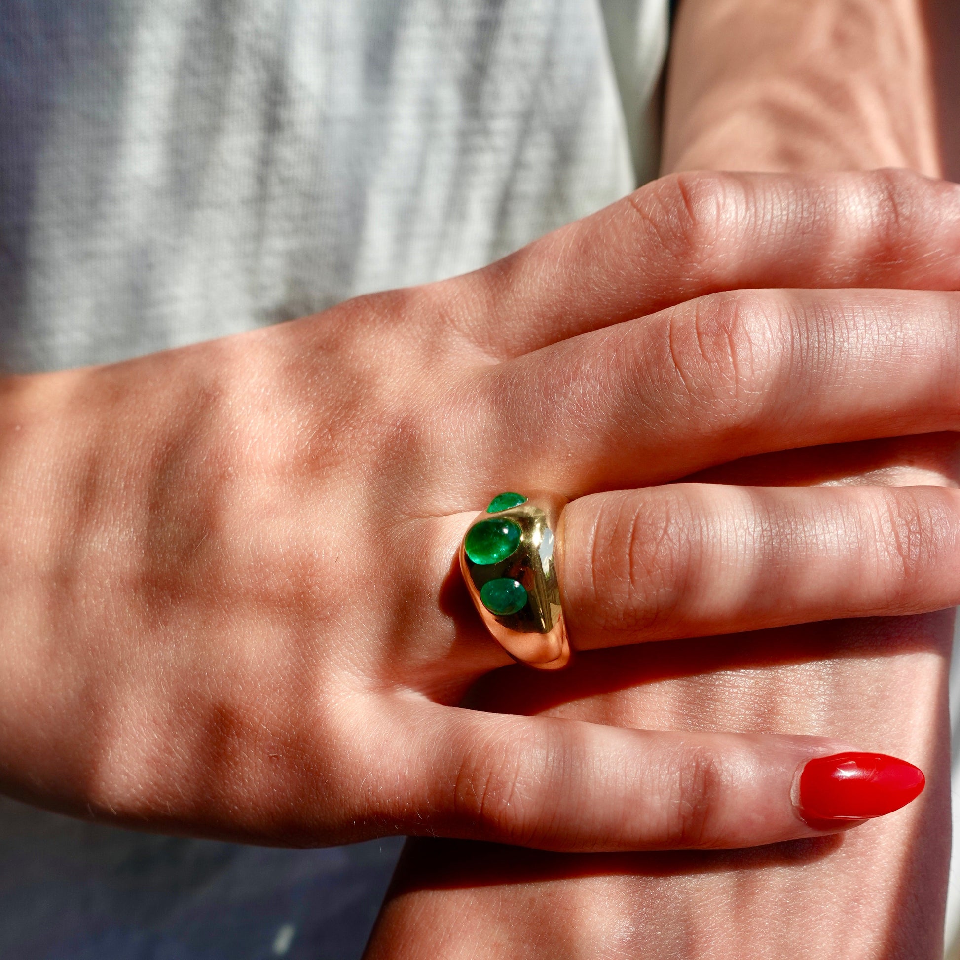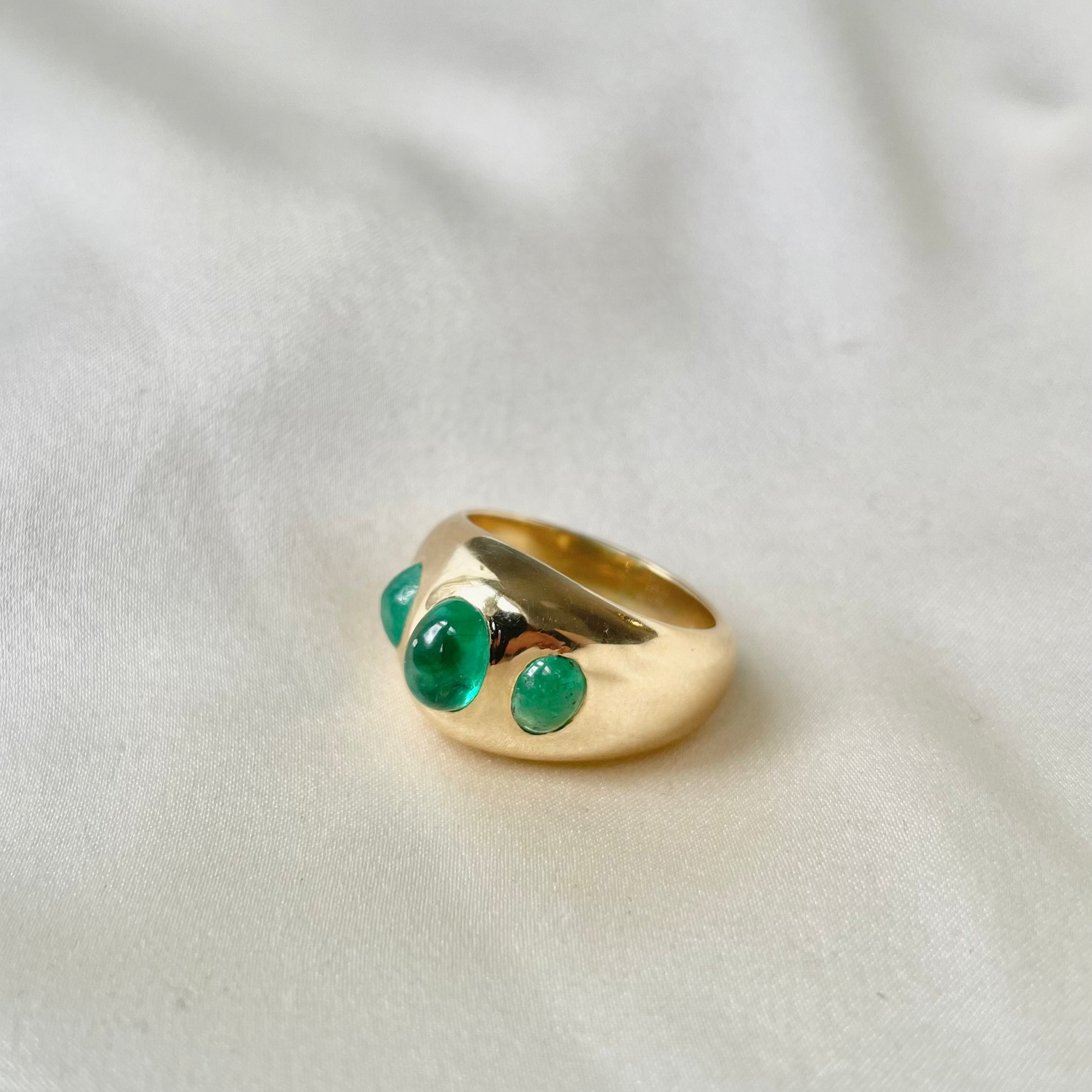A rare vintage creation from Swiss house Gübelin, this 18k yellow gold ring is set with three luminous emerald cabochons. The bold, signet-style silhouette showcases the largest stone at center, flanked by two smaller cabochons in a refined, flush setting. The rich green of the emeralds paired with the sculptural gold mounting reflects the sophistication and craftsmanship that have made Gübelin one of the world’s most esteemed jewelers.