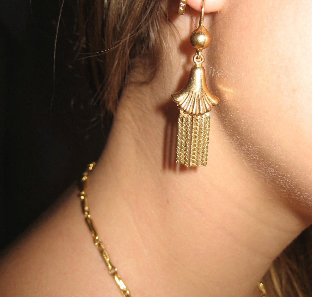 These vintage Italian earrings feature a sleek, modern design with a hint of vintage flair in 18-karat gold. They have a distinctive round half-dome top and elegant chain fringe that moves with you.
